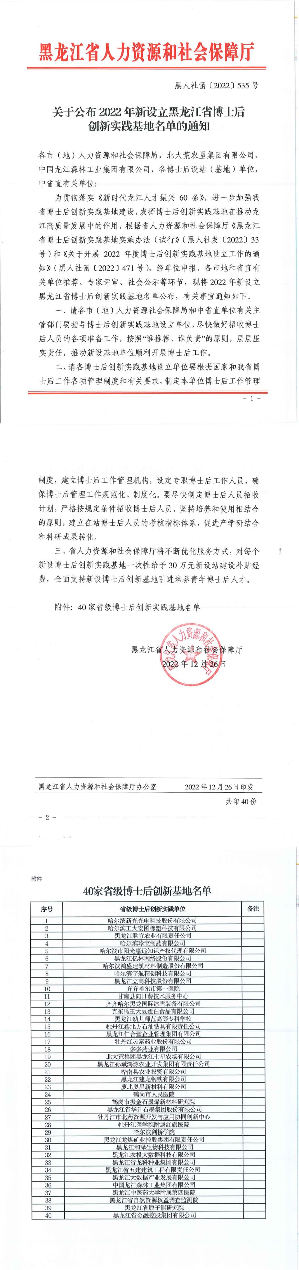 为贯彻落实《新时代龙江人才振兴60条》,充分发挥博士后制度在吸引培养创新型青年高层次人才和促进产学研用深度结合等方面重要作用,推动我校人才事业高质量发展,经学校申报、专家评审、社会公示等环节,我校“牡丹江市北药资源开发与应用协同创新中心”和“牡丹江医学院附属红旗医院”正式由黑龙江省人力资源和社会保障厅批复设立为黑龙江省博士后创新实践基地。