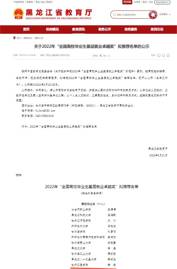 韩淼同学在全省全国高校毕业生基层就业卓越奖中,脱颖而出,作为黑龙江省11个候选人之一,推荐到教育部全国高校毕业生基层就业卓越奖评选人选。经各省(区、市)遴选推荐,全国共确定奖励优秀高校毕业生398人,优秀指导教师60人,韩淼同学名列其中。