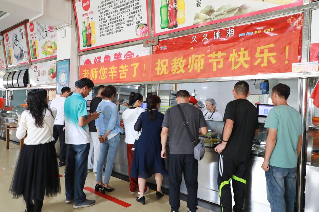 教工餐厅精心布置,悬挂横幅,为教师们精心准备了各种水果、糕点和丰盛的菜肴,伴随着阵阵欢声笑语,让大家的身心得到了充分的愉悦和放松。
