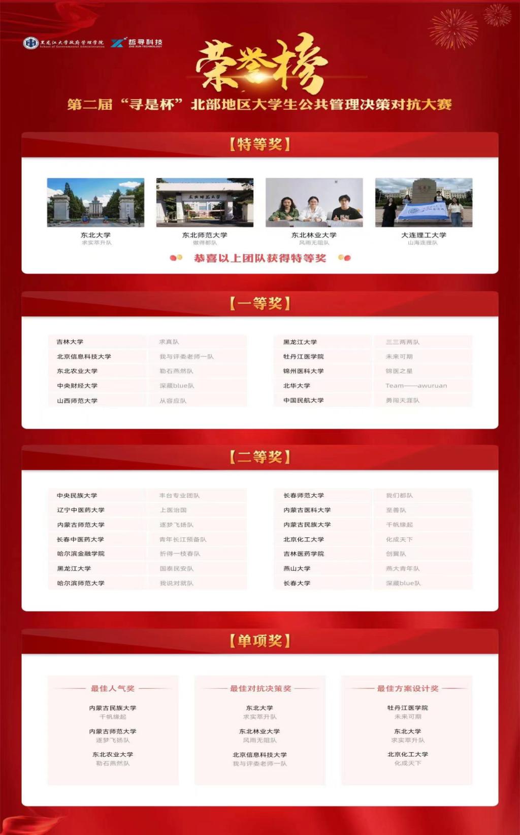 9月16日至17日,由黑龙江省公共管理学会和黑龙江省政治学会主办、黑龙江大学政府管理学院和创业教育学院承办、上海哲寻信息科技有限公司协办的第二届“寻是杯”北部地区大学生公共管理决策对抗大赛在黑龙江大学举办。来自北京、天津、河北、山西、内蒙古、辽宁、吉林、黑龙江等地27所高校144名同学参加了大赛。在我校赵红梅、孙布克两位老师的指导下,卫生管理学院2022级公共事业管理专业王博琦、翟莹莹、王雅婷三位同学组成的“未来可期”队从28支参赛队伍中脱颖而出,荣获团体一等奖和最佳方案设计奖。