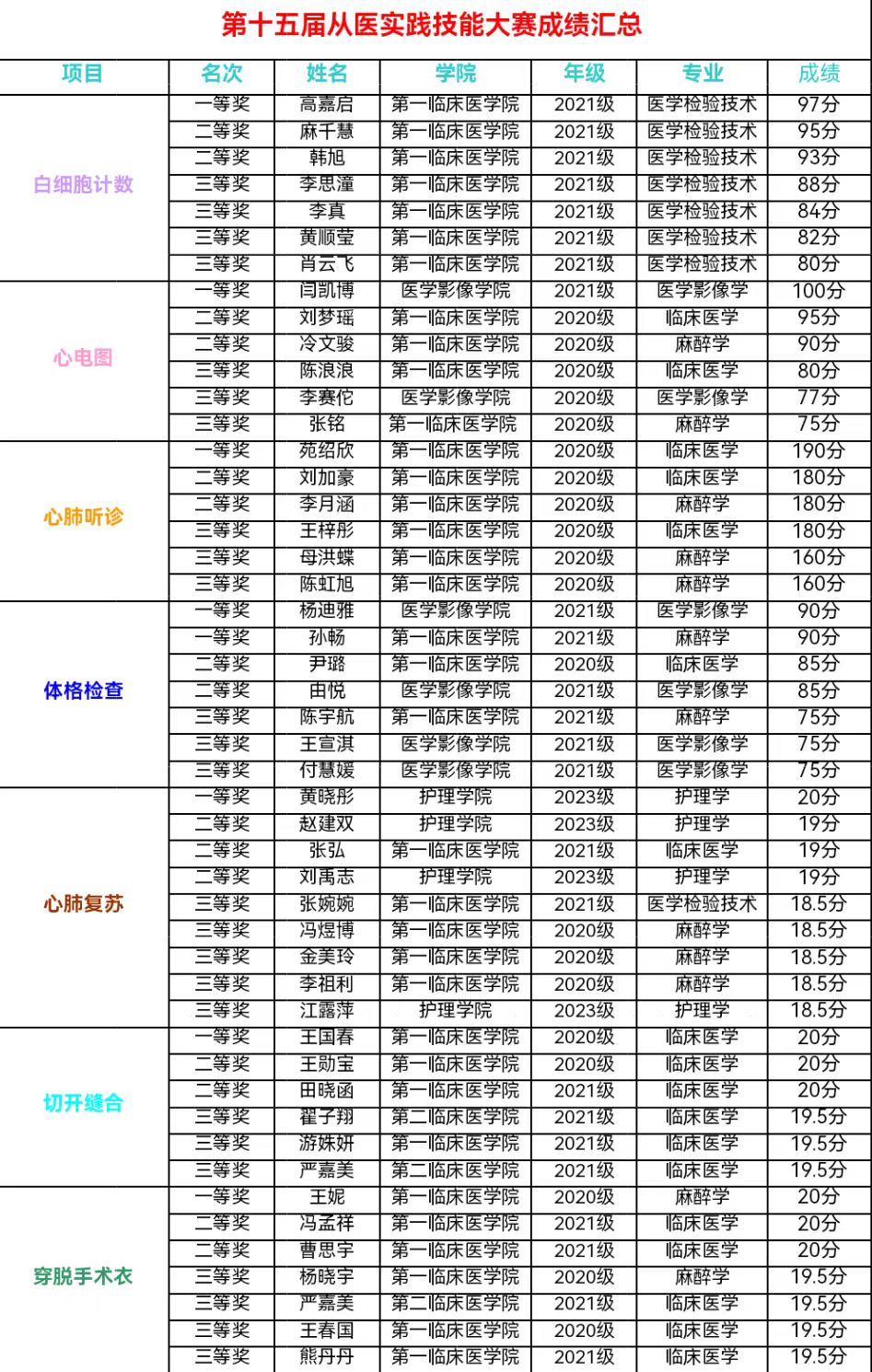 本次大赛设有体格检查、穿脱手术衣和切开缝合、心肺复苏、阅心电图、白细胞计数、心肺听诊等六项比赛。内容涵盖临床医学、麻醉学、医学检验学、护理学等专业实践技能操作的考核和基础理论知识的考查。医学影像学院、第一临床医学院、第二临床医学院、护理学院等各个学院共300余名学生参加比赛。