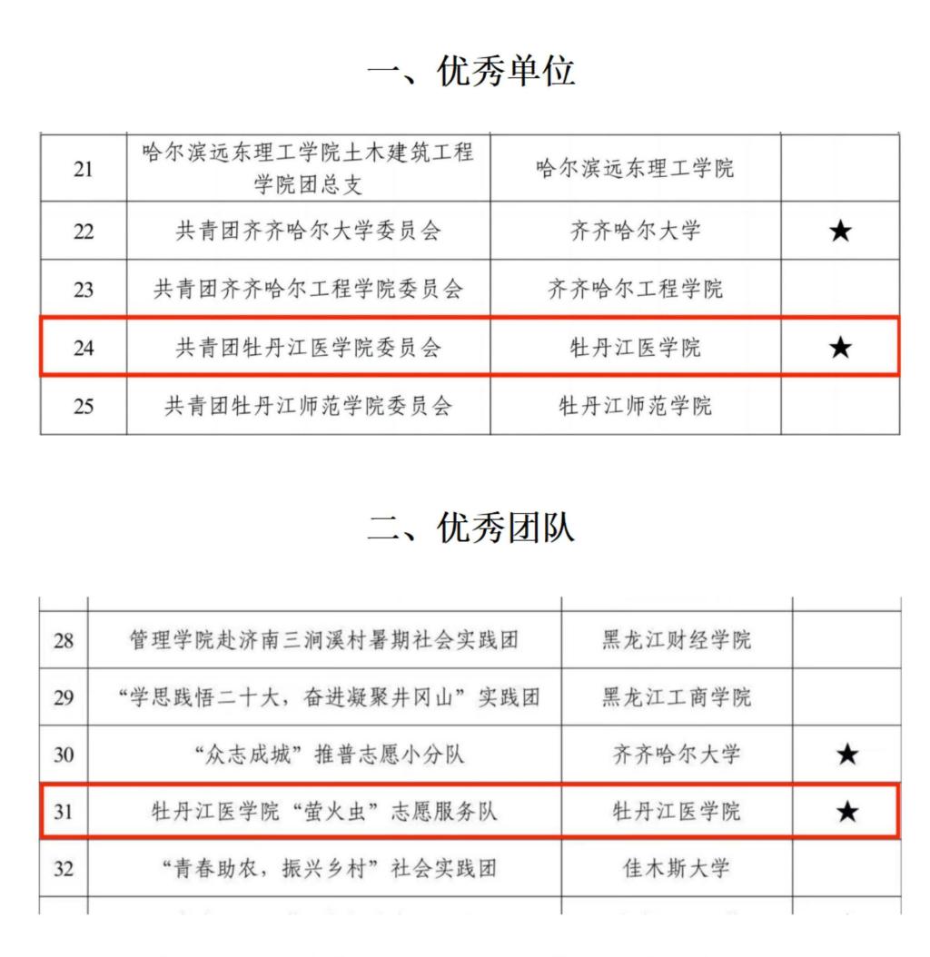 近日,共青团黑龙江省委对2023年黑龙江省大中专学生志愿者暑期文化科技卫生“三下乡”社会实践活动优秀典型进行公示,我校团委获评2023年度黑龙江省大中专学生志愿者暑期文化科技卫生“三下乡”社会实践活动优秀单位,我校“萤火虫”志愿服务队获评“优秀团队”,校团委和“萤火虫”志愿服务队都将作为黑龙江省2023年度全国大中专学生志愿者暑期文化科技卫生“三下乡”社会实践活动拟推荐对象。