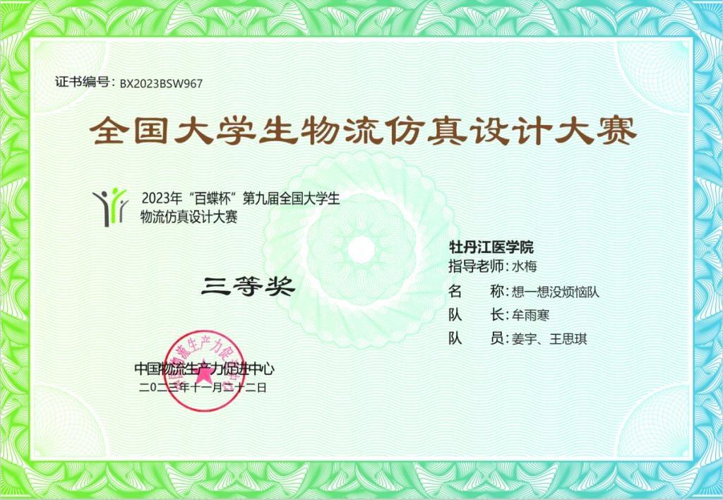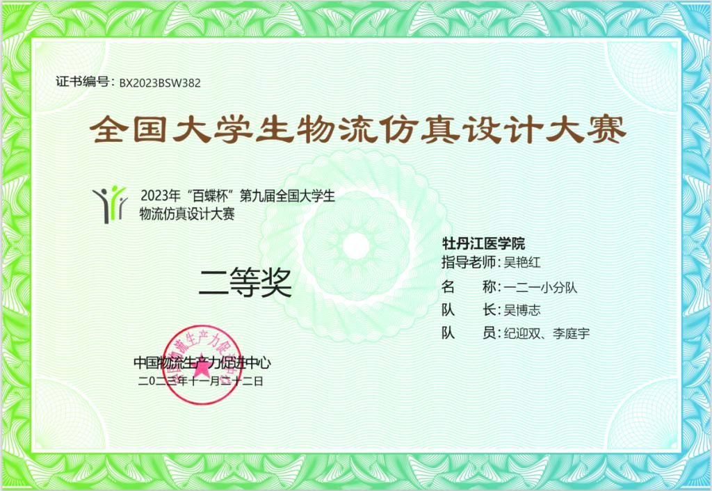 11月20日,由中国物流生产力促进中心主办的“百蝶杯”第九届全国大学生物流仿真设计大赛圆满结束。我校卫生管理学院吴博志、纪迎双、李庭宇等六名同学组成2个团队参赛,分别荣获全国大学生物流仿真设计大赛二等奖、三等奖,吴艳红、水梅老师被评为“优秀指导教师”。