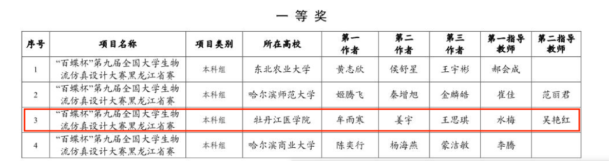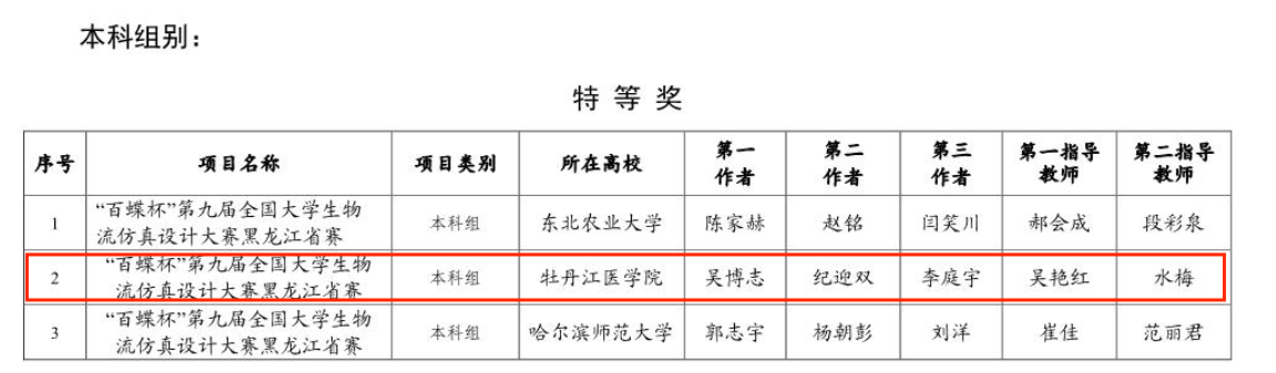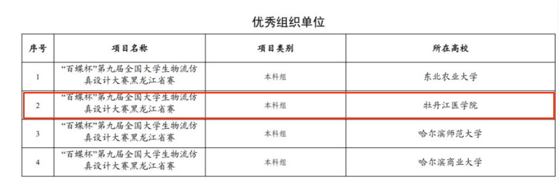 在11月4日由黑龙江省普通高等学校创新创业教育指导委员会主办、东北农业大学承办的“百蝶杯”第九届全国大学生物流仿真设计大赛黑龙江省赛中,我校两支队伍喜获黑龙江省赛特等奖和一等奖,以第二名的好成绩代表黑龙江省参加“百蝶杯”第九届全国大学生物流仿真设计大赛总决赛,我校被评为优秀组织单位。