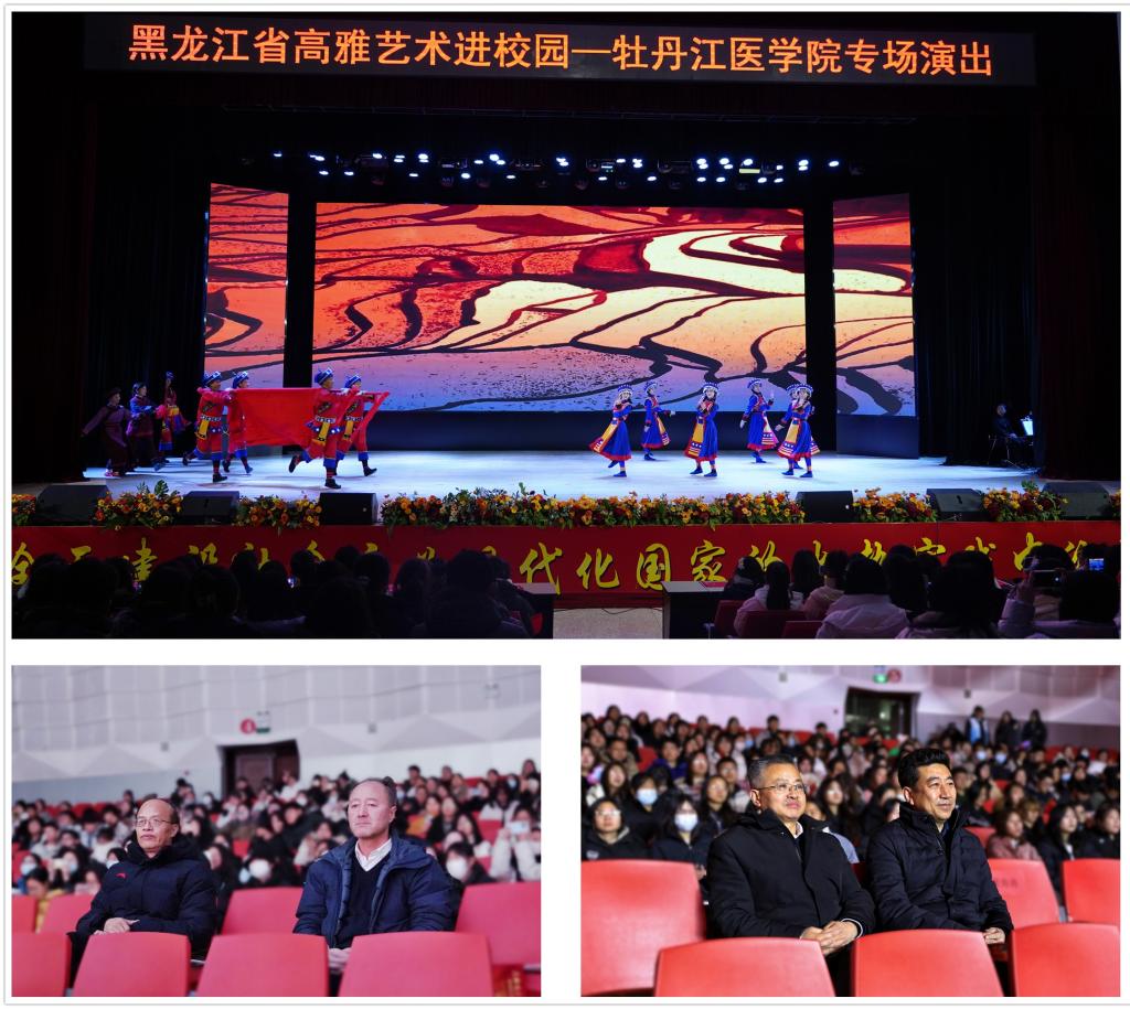 为全面加强和改进新时代学校美育工作,切实提高学生审美和人文素养,进一步强化学校美育育人功能,由黑龙江省教育厅、省文旅厅联合组织的高雅艺术进校园活动于12月11日走进我校,黑龙江省评剧艺术中心大型原创现代评剧《女儿》在我校文体馆隆重上演。学校党委书记马宏坤、党委副书记张德才、副校长刘星、纪委书记黄海涛与师生共同观看演出。