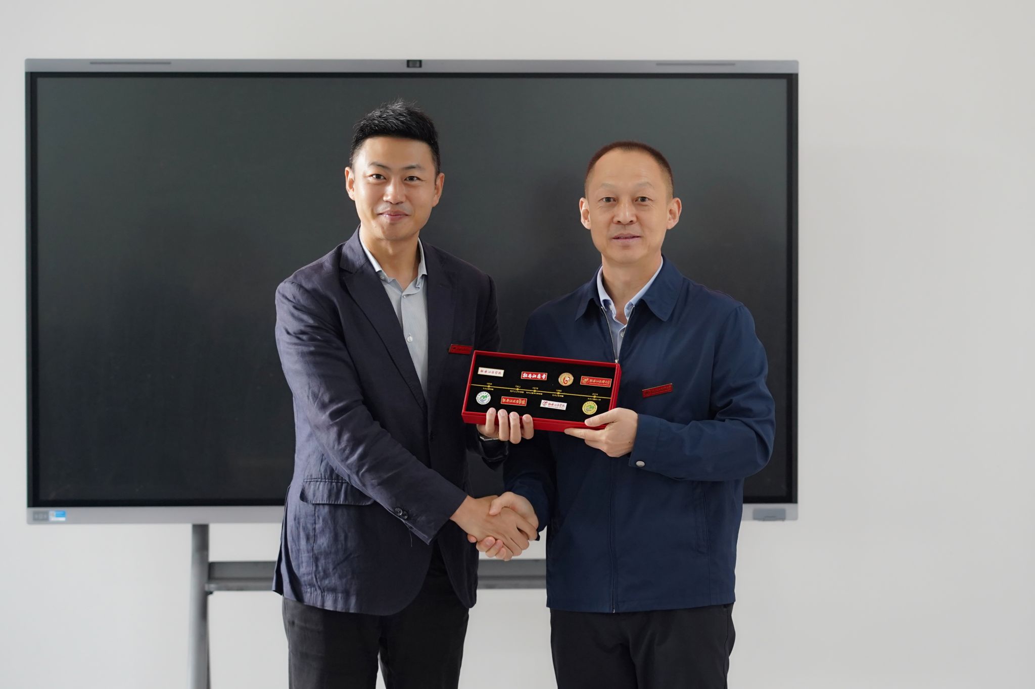 李春江代表学校赠送高闯纪念版校徽,该套校徽汇集了牡丹江医科大学各个历史时期的校徽样式,其中蕴含着从牡丹江医学院到牡丹江医科大学的历史征程,镌刻并传承着“执着、爱校、求实、合作、创新、奉献”的牡医精神,希望以高闯为代表的牡医校友们带着母校的祝福在各自专业领域深耕不辍,勇攀高峰。值此国庆中秋双节来临之际,胡文华代表学校送上承载团圆心意与母校温情的月饼,共同祝愿万千校友佳节安康,携手共赴美好。