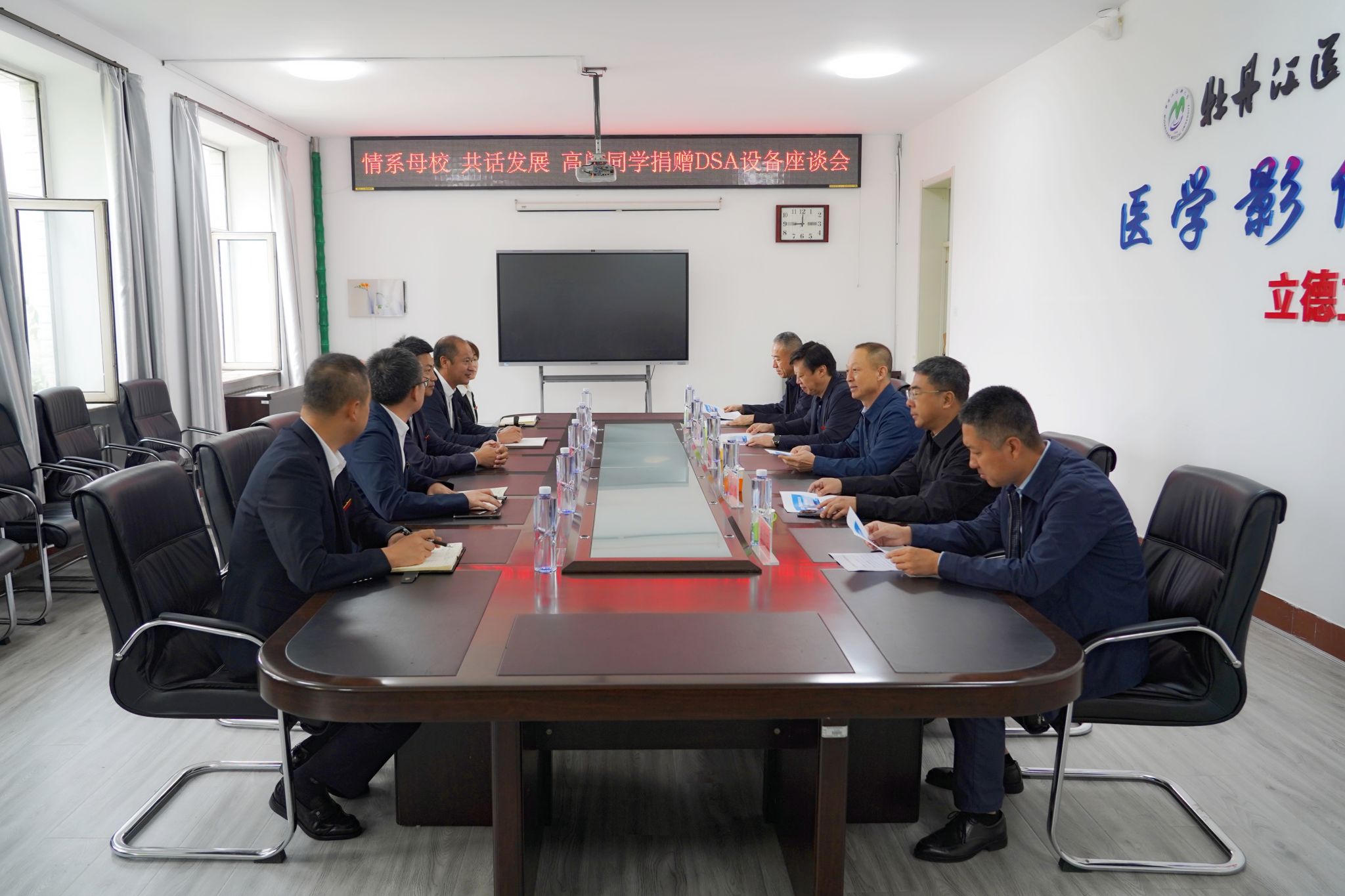 高闯深情追忆了难忘的牡医时光,分享了成长经历,对母校的培养和老师的教诲表达诚挚感恩。他表示,无论事业发展到何种阶段、身处何方,心始终牵挂母校,惦念影像。此次返校,他见证学院面貌日新月异,各项事业蒸蒸日上,内心倍感骄傲与自豪。他希望通过捐赠教学设备,为母校医学影像教育教学水平提升尽绵薄之力,为学弟学妹们提供更优质的学习实践条件,并衷心祝愿母校各项事业再谱新篇、再创辉煌。座谈会上,与会人员围绕医学影像行业发展趋势、产学研深度融合路径、校友工作提质增效等议题展开深入研讨,现场氛围热烈融洽。