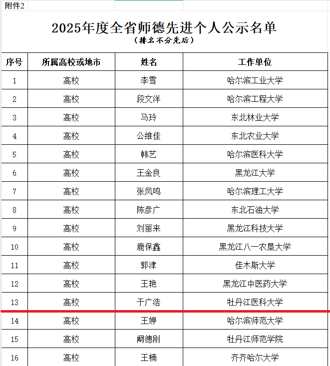 近日,黑龙江省教育厅公布了2025年度全省教育系统师德建设先进集体和师德先进个人评选结果。经单位推荐、专家评审和省级公示等程序,我校医学影像学院于广浩教授荣获“2025年度黑龙江省师德先进个人”称号。