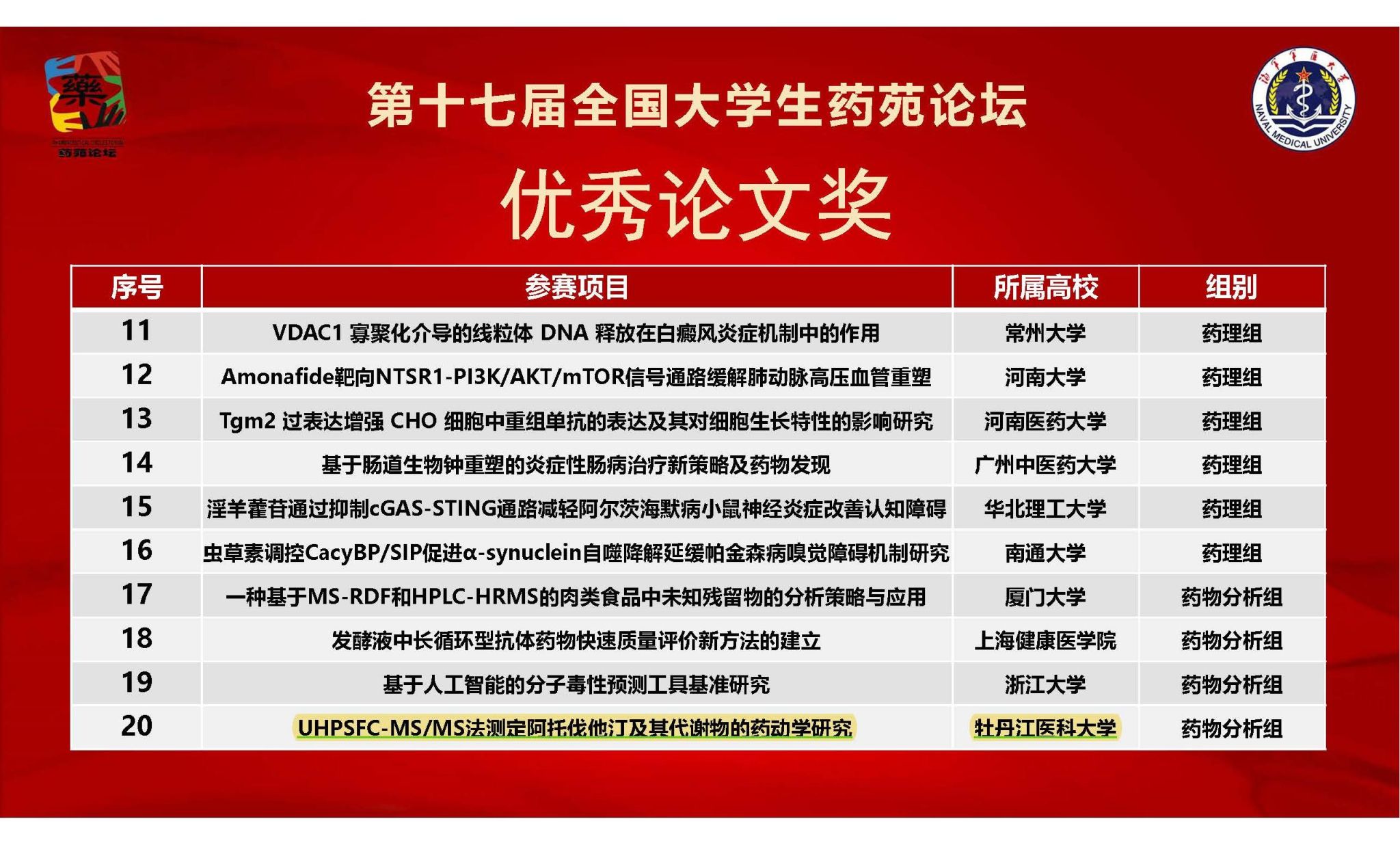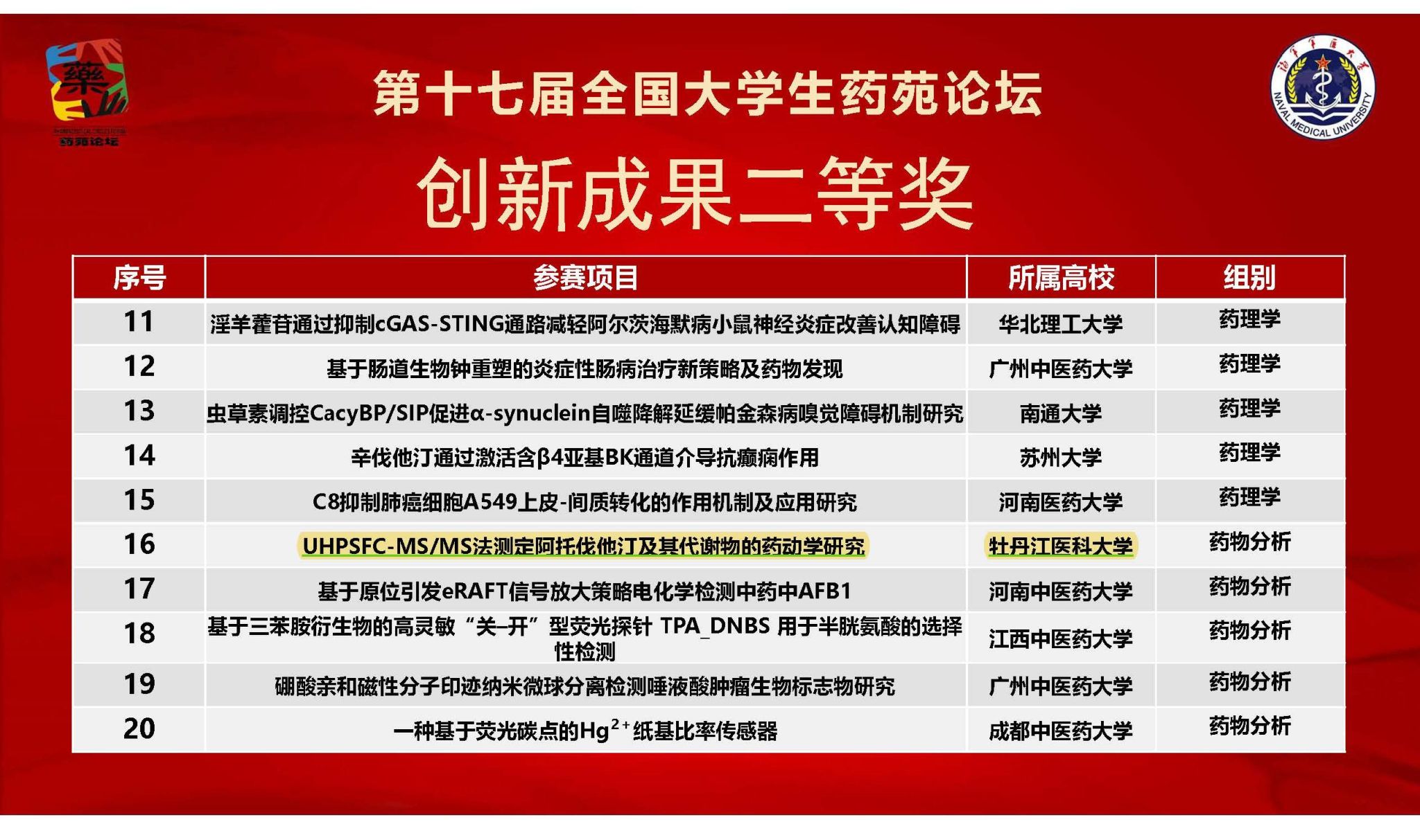 10月17日至19日,第十七届“全国大学生药苑论坛”总决赛在上海海军军医大学隆重举办。在“药学科学”赛道的激烈角逐中,由李文超、关会林老师指导,尹祎琳、王伊瑶、黄崇鑫三位同学通力协作完成的项目《UHPSFC-MS/MS法测定阿托伐他汀及其代谢物的药动学研究》,凭借严谨的实验设计与高质量的研究成果,成功斩获创新成果二等奖与优秀论文奖双项荣誉,实现了我校在这个领域的新突破。
