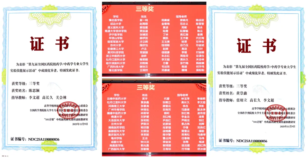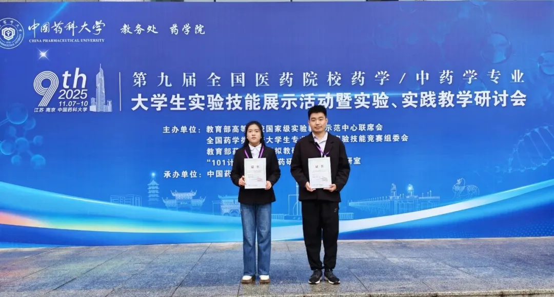 2025年11月7日至9日,第九届全国医药院校药学/中药学专业大学生实验技能展示活动在中国药科大学成功举办。我校药学院首次组队参与这一国家级赛事,在李文超、高长久、张朝立、关会林四位老师的联合指导下,陈思颖、黄崇鑫两位同学凭借扎实的理论功底、规范的实践操作与沉着稳健的临场表现,双双斩获三等奖,一举实现我校在该领域国家级竞赛中的历史性突破!