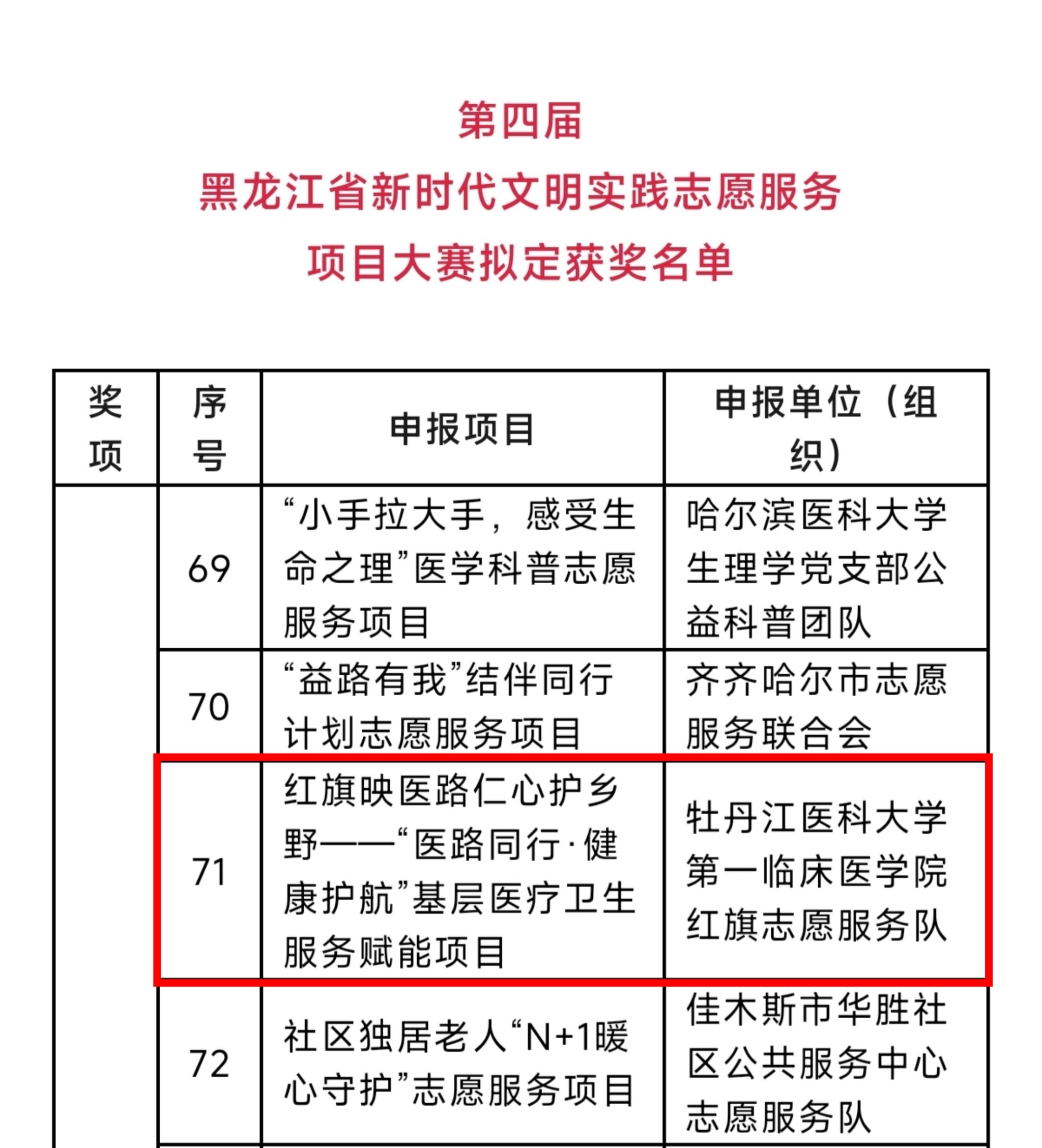 近日,第四届黑龙江省新时代文明实践志愿服务项目大赛圆满落幕。经过申报推荐、资格审核、评委终评等多轮严格遴选,我校推报的“红旗映医路 仁心护乡野——‘医路同行·健康护航’基层医疗卫生服务赋能项目” 获大赛“创意奖”。