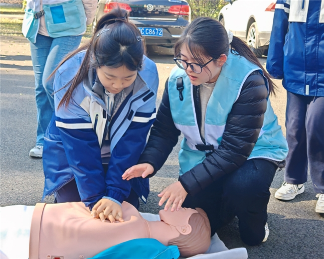 参观环节结束后,活动转入“实践体验+生涯指导”双轨环节:在心理健康教育中心门前,志愿者以“理论讲解+实操演示”的形式,详细传授海姆立克急救法、心肺复苏操作流程,学子们分组上前模拟练习,在亲手实践中掌握应急救护技能,强化“健康守护者”的责任意识。
