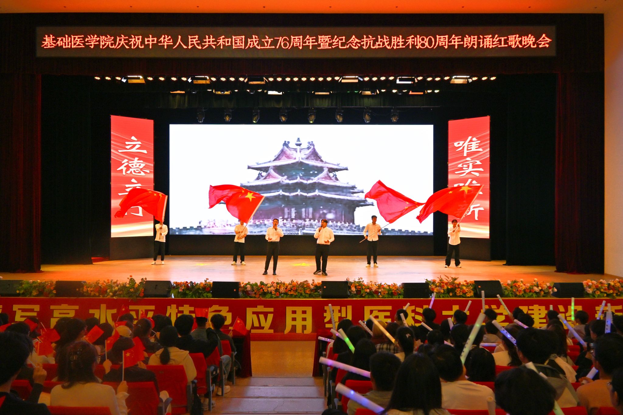 为传承红色基因、厚植家国情怀,2025年9月26日,基础医学院于学校“一站式”学生社区文体活动中心精心举办“赓续抗战薪火 唱响时代华章”庆祝中华人民共和国成立76周年暨纪念抗战胜利80周年朗诵红歌晚会。牡丹江医科大学学生工作部(处)部(处)长王俊林,基础医学院党委副书记刘颖及基础医学院全体辅导员参加晚会,与同学们共同沉浸在红色旋律与经典诵读的热烈氛围中。