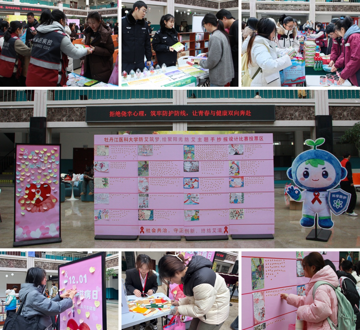 12月1日当天,图书馆一楼阳光大厅举办防艾科普主题活动,我校团委、医务处联合团市委、牡丹江市疾控中心及四城区疾控中心共同打造,吸引600余名师生踊跃参与。现场亮点纷呈,疾控专家坐镇答疑、发放科普物料;防艾手抄报优秀作品线下展示,学子用画笔传递防艾心声;“无艾寄语展板”前,大家写下美好期许;趣味答题抽奖活动推动知识普及。多元创新的科普形式,让防艾理念真正深入人心,有效扩大了宣传覆盖面与影响力。
