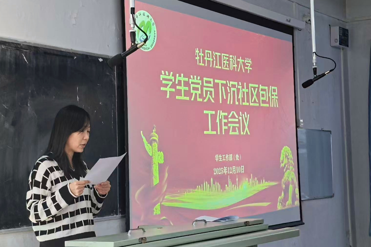 为深入落实立德树人根本任务,推动学生党员在社区建设中发挥先锋模范作用,12月10日,党委组织部联合学生工作部(处)在学生社区学生党员工作站召开2025-2026学年“一站式”学生社区学生党员包保工作推进会,围绕《牡丹江医科大学“一站式”学生社区学生党员工作制度》,为本次入选的学生党员进行专题解读和工作部署。党委组织部葛戈老师、学生工作部(处)思想政治教育科刘旭萍老师、全体公寓辅导员及各公寓楼学生党员参加会议。